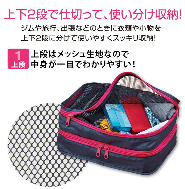 マチ付で厚みがあり、たっぷり収納!【2019新作】 トラベルポーチ おしゃれ メンズ 旅行 便利グッズ ポーチ 撥水加工生地 メッシュ生地 2段式 持ち手付き ジム 出張 衣類収納 小物収納 可愛い トラベルバッグ●商品説明ジムや旅行、出張などに衣類や小物を上下2段に分けて使いやすくスッキリ収納! 上段はメッシュ生地なので中身が一目でわかりやすい。