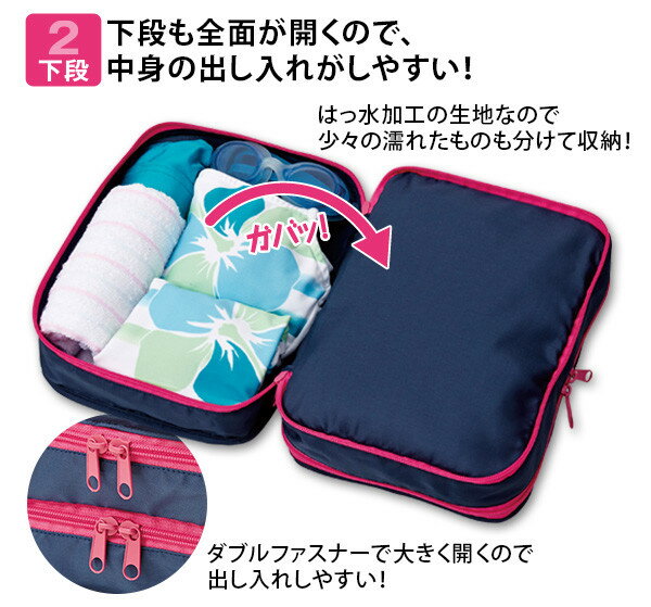 はっ水加工の生地なので、少々の濡れたものも分けて収納!持ち手付でジムや旅行などの持ち運びにも便利です。